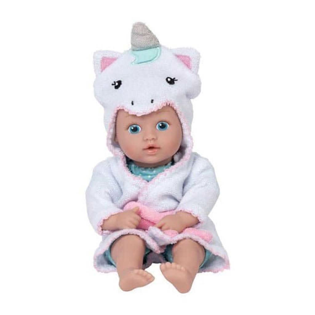 Adorable 3-Piece Set: Includes an 8.5-inch baby doll, an attached blue polka-dot swimsuit, and a removable embroidered unicorn hooded bathrobe.