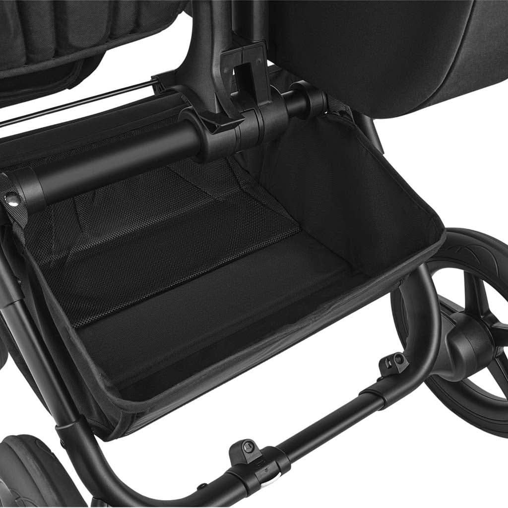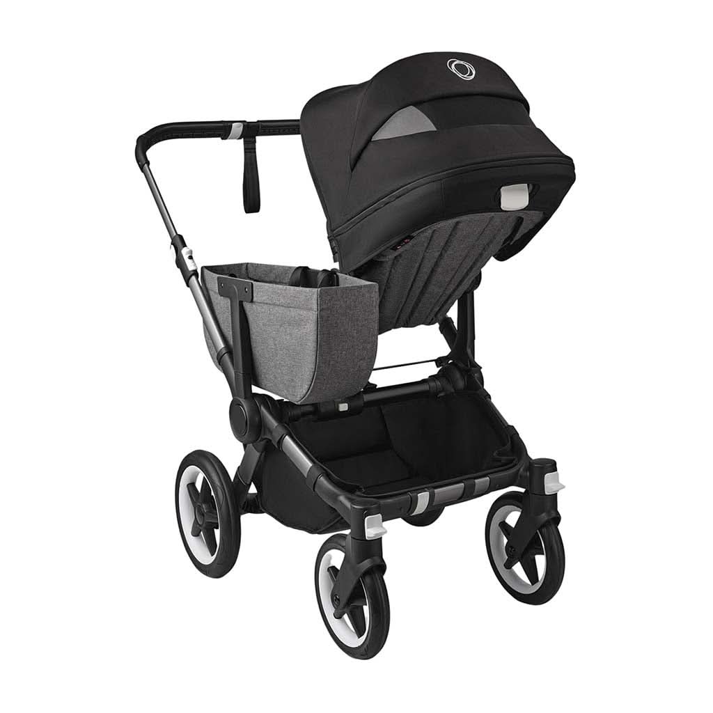 The Bugaboo Donkey 5 Mono has a total storage capacity of 44 lbs, with 22 lbs in the underseat basket and an additional 22 lbs in the side luggage basket.