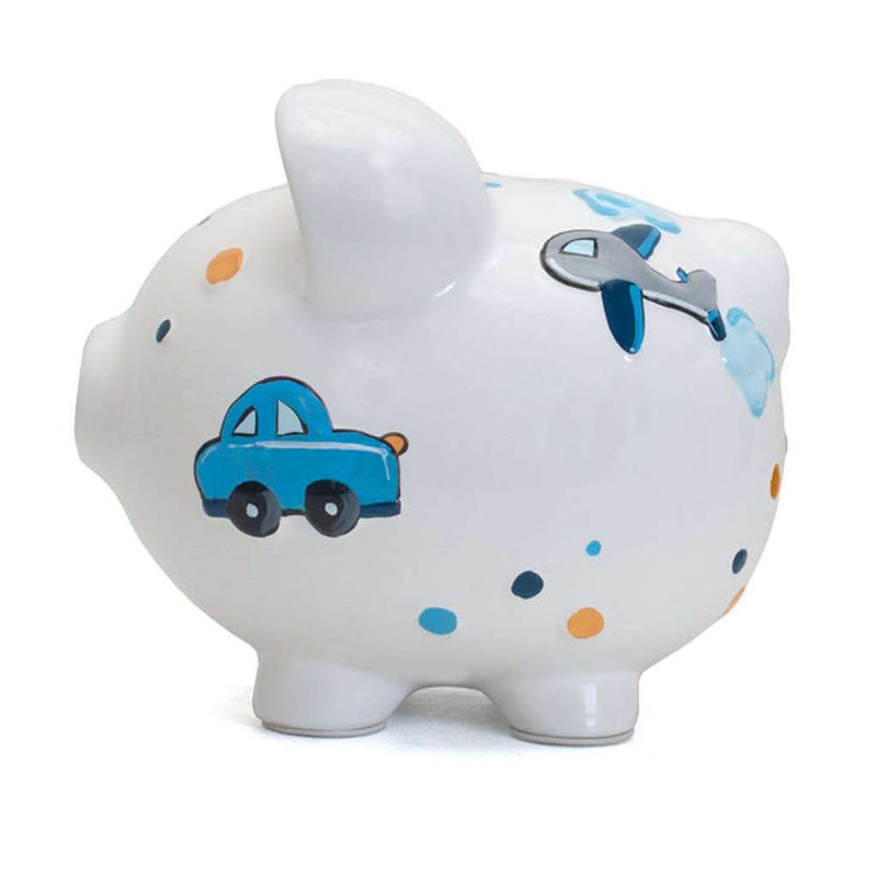 The Choo Choo Transportation Piggy Bank itself cannot be personalized, but Child to Cherish offers other piggy banks that can be customized with a child's name.
