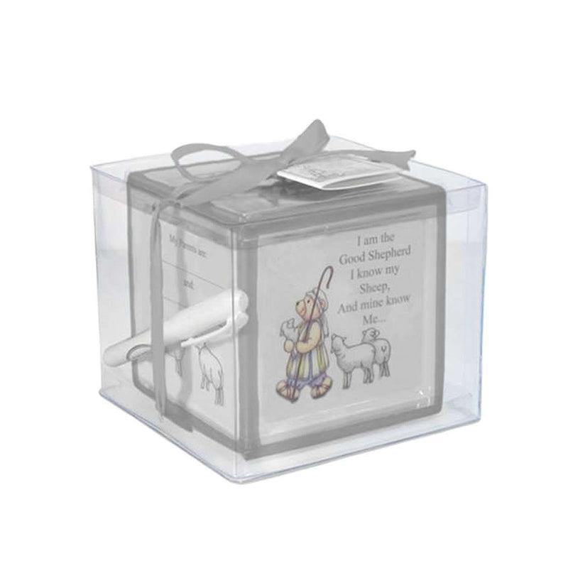 The Child to Cherish Christening Block is a beautifully crafted ceramic keepsake designed for commemorating a child's special christening moments. Featuring charming blue or Pink borders and customizable sides, this block allows parents to record and personalize their child's cherished milestones. Ideal as a thoughtful gift or keepsake, it serves as both a decorative item and a functional coin bank. The Christening Block comes with a pen for easy personalization, making it a unique treasure for families to remember this significant occasion. It is perfect for display on shelves or dressers.