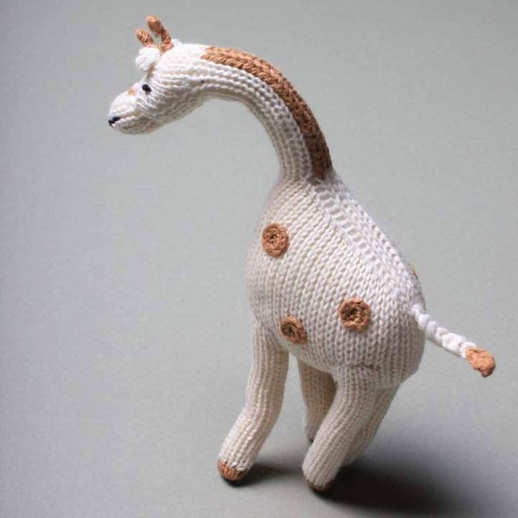 Estella's organic giraffe baby toy rattle is a lovable new friend for a newborn baby girl or boy and makes the perfect finishing touch to any baby gift. This animal's long neck and legs, spotted body, and gentle rattle will engage your little one's senses and keep him or her happily entertained.