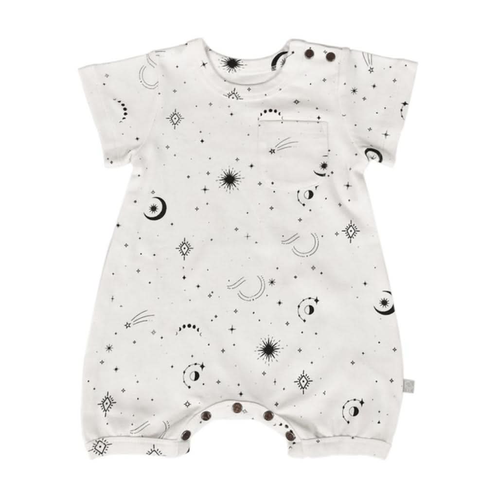 The Finn & Emma Short Sleeve Romper - Celestial is designed for parents who want their little ones to stay comfortable, stylish, and ready for any adventure. Perfect for baby boys and girls, this romper is made from buttery-soft organic cotton, ideal for all-day wear. Whether your baby is crawling, playing, or napping, this romper ensures they are cozy and cool. Featuring an adorable celestial print, it’s the perfect blend of comfort, style, and sustainability, making it a must-have for active babies.