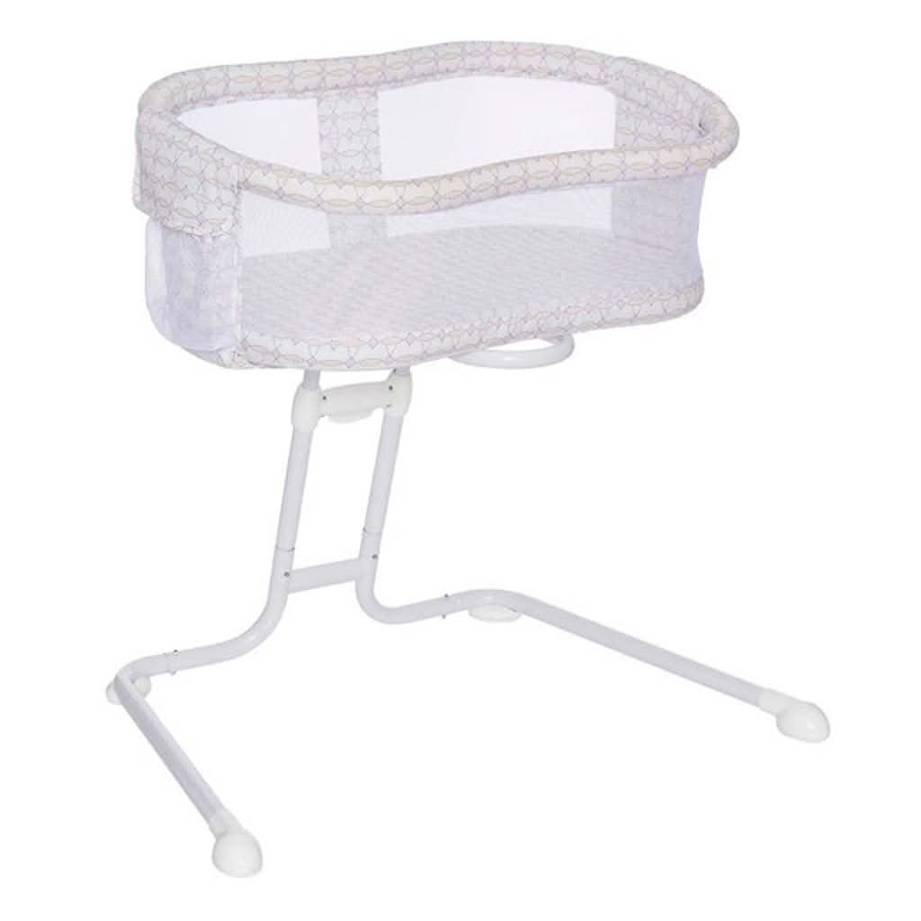 To get in and out of bed hassle-free, simply glide the BassiNest away from the bed - ideal for all mothers, but especially for those recovering from C-sections. Its unique design means the baby is visible at your eye level, allowing you to soothe your baby quickly, while mesh walls provide maximum breathability. In addition, its side wall lowers and automatically returns, allowing you to tend to your baby while still in bed. Its stable, height adjustable base fits next to almost any bed. Recommended for babies up to 20 lbs., or five months of age, or whenever baby begins to show signs of pushing up to hands and knees.