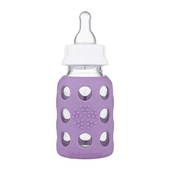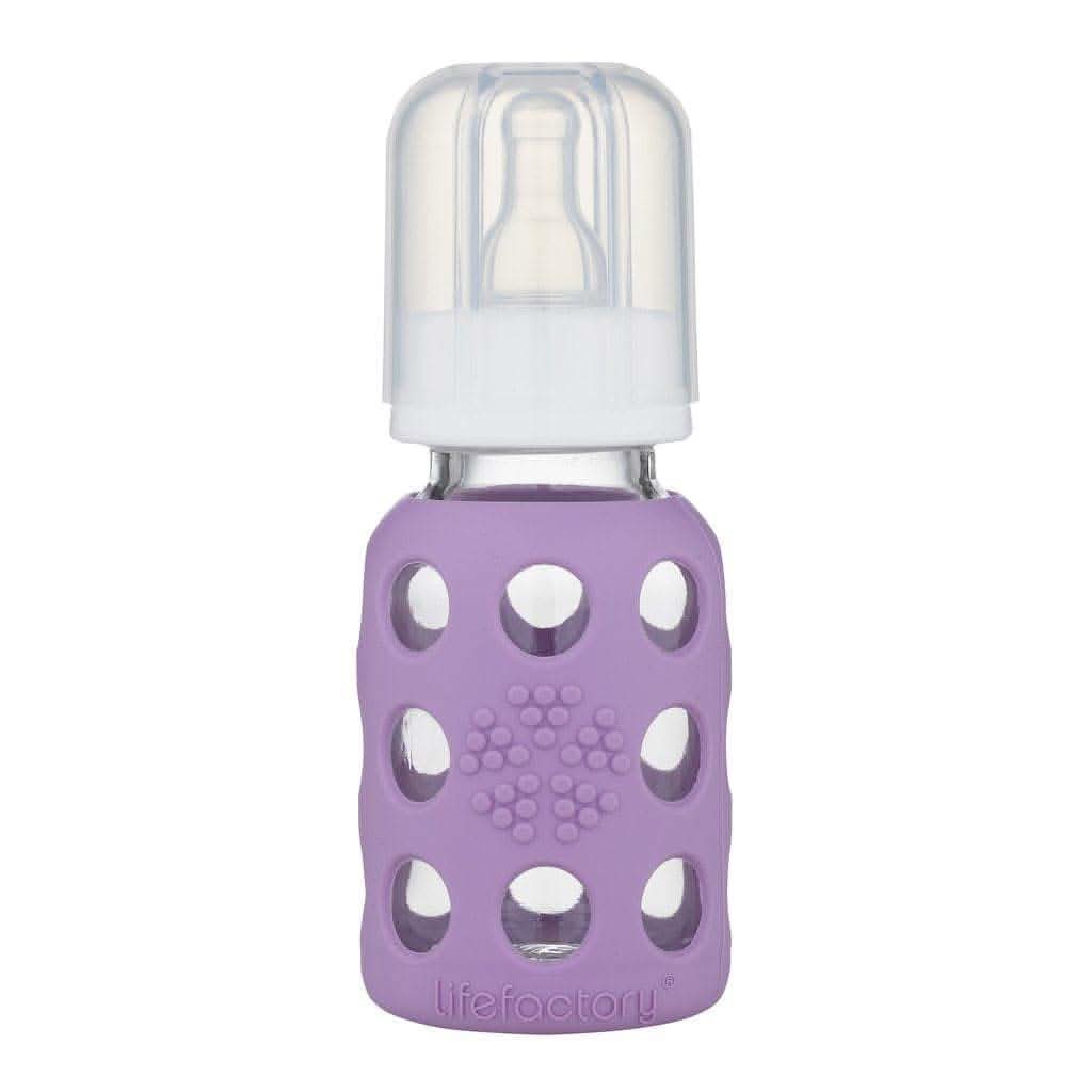 Life Factory Glass Baby Bottle Lavender, 4 oz. is safe for baby and built to last. The bottle is made from thermal shock-resistant borosilicate glass, allowing bottles to safely transition from freezer to boiling water. The silicone sleeve and other parts are made with BPA-free, phthalate-free, and FDA-approved materials. Includes a glass bottle, silicone sleeve, cap, ring, stopper, and a Stage 1 (0-3 months) silicone nipple.