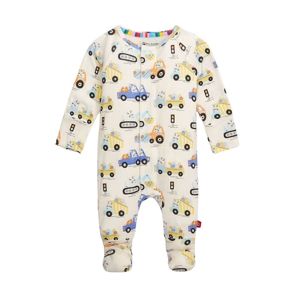 The footie features SewSafe™ magnetic closures running from the neck to the upper thigh for sizes up to 0-3m and from neck to crotch for sizes 3-6m, making dressing quick and easy.