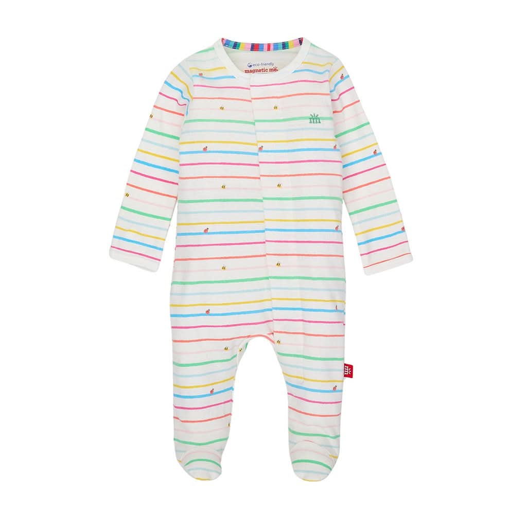 The Magnetic Me Rainbow Road Organic Cotton Magnetic Footie is the ultimate in comfort and convenience for parents. Designed for babies up to 12 months, this footie simplifies dressing with its innovative SewSafe™ magnetic closures, making late-night diaper changes or morning get-ready sessions a breeze. Crafted from GOTS certified organic cotton, it’s not only soft and breathable but also gentle on sensitive skin, ensuring your baby’s comfort around the clock. This footie is an essential addition to your baby's wardrobe, combining ease of use, sustainability, and style.