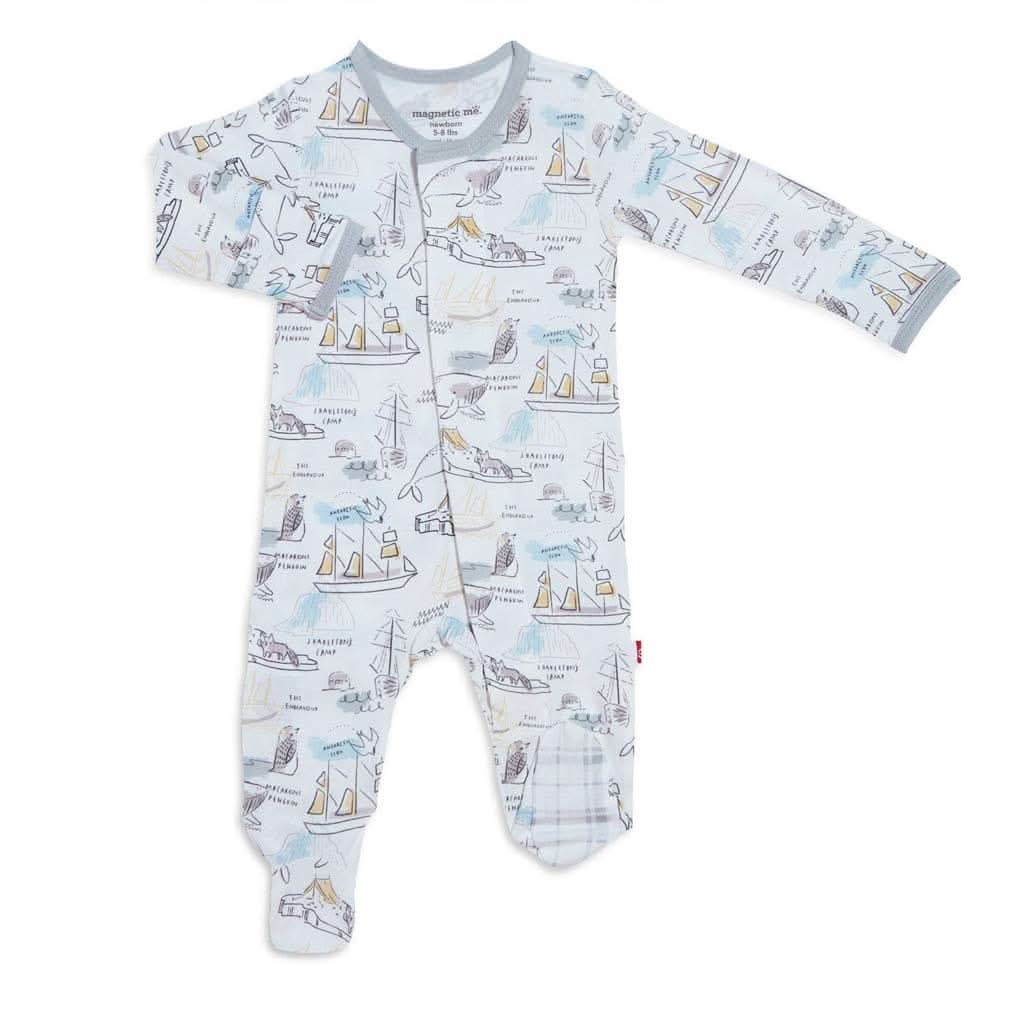Magnetic Me Shakleton Modal Magnetic Footie is a soft, stylish all-day and all-night wardrobe staple with smart magnetic fasteners that makes changing time painless. With no over-the-head design, simply open the outfit, insert baby, and BOOM, DONE! - the footie practically closes itself. Machine wash as directed.