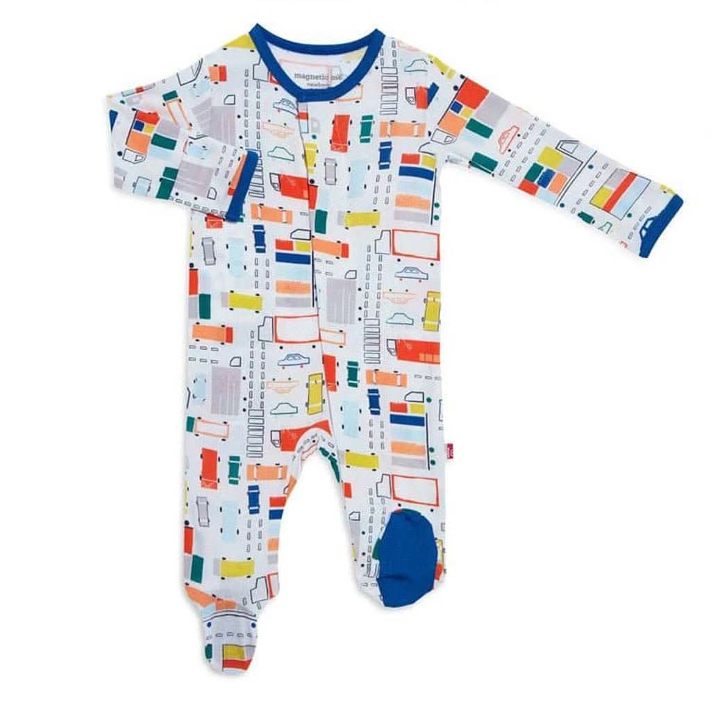 Magnetic Me Traffic Jammies Modal Magnetic Footie is a soft, stylish all-day and all-night wardrobe staple with smart magnetic fasteners that makes changing time painless. With no over-the-head design, simply open the outfit, insert baby, and BOOM, DONE! - the footie practically closes itself. Machine wash as directed.