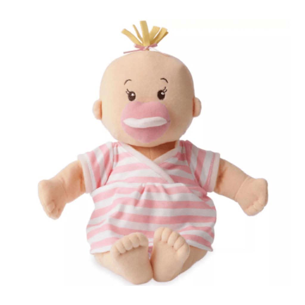 Baby Stella Peach Soft Nurturing Doll includes a removable diaper, a one-piece outfit with a hook and loop closure, and a pacifier that attaches magnetically to her mouth. Baby Stella by Manhattan Toy is an ideal first baby doll collection that will encourage little ones to role play, nurture, and care. Baby Stella dolls are completely soft and beautifully crafted with life-like details such as a belly button and a perfectly plump tummy. You can change her outfits and every doll comes with a magnetic pacifier. This unique collection of baby dolls also offers a variety of soft and safe doll accessories that allow little ones a caregiving experience.