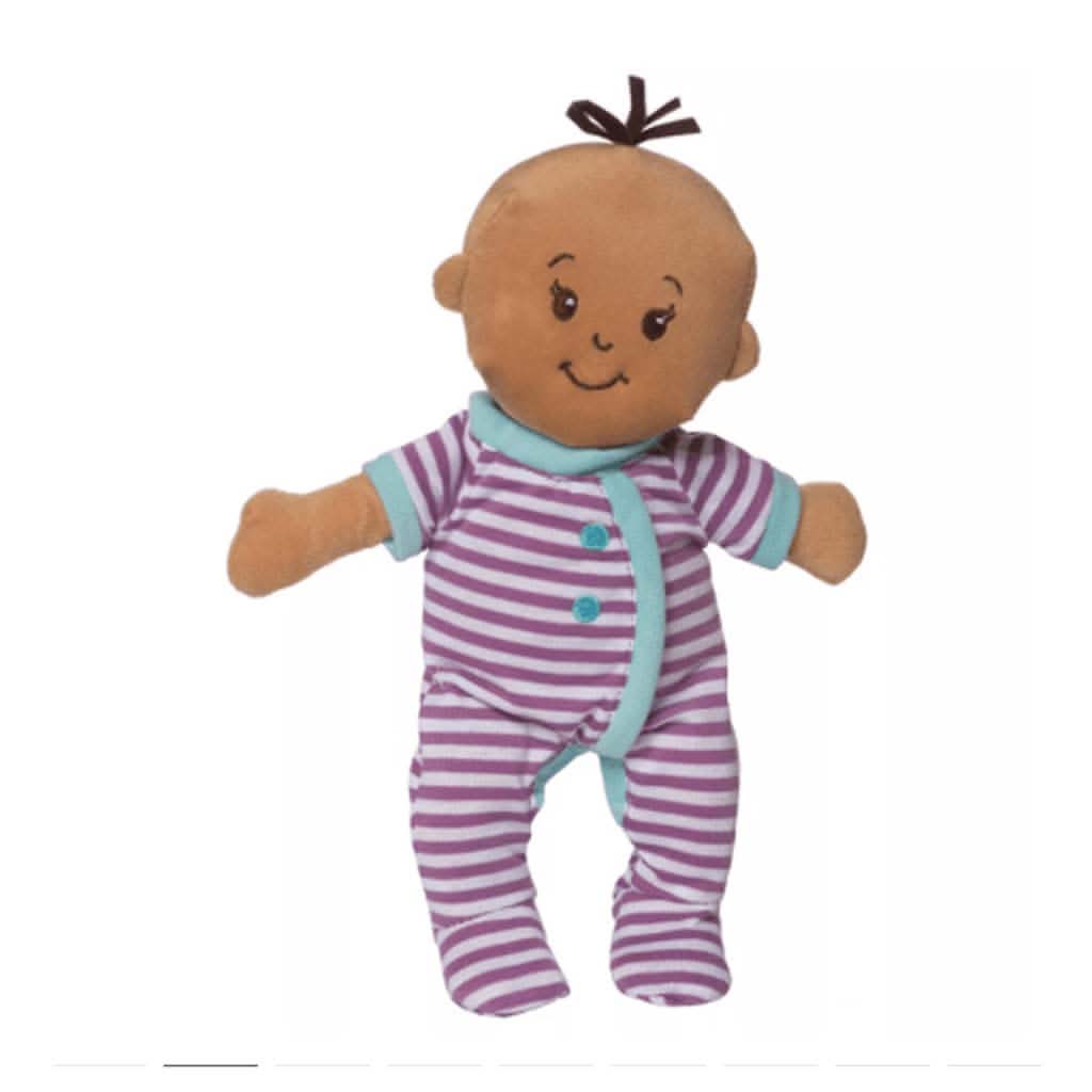 It's bed time for Wee Baby Stella! This sleepy time set comes with a Wee Baby Stella Beige doll, magnetic bottle and pacifier, soft bear and paper storybook. The 12 inch Wee Baby Stella has the same lifelike qualities as her bigger 15 inch Baby Stella cousin and comes with a soothing Celessence lavender scent when squeezed. Wee Baby Stella by Manhattan Toy is an ideal first baby doll collection that will encourage little ones to role play, nurture and care. Wee Baby Stella dolls are completely soft and beautifully crafted with lifelike details such as a belly button and perfectly plump tummy. You can change her outfits and every doll comes with a magnetic pacifier. The Wee Baby Stella Collection also offers a variety of soft and safe accessories that allow little ones a care-giving experience.