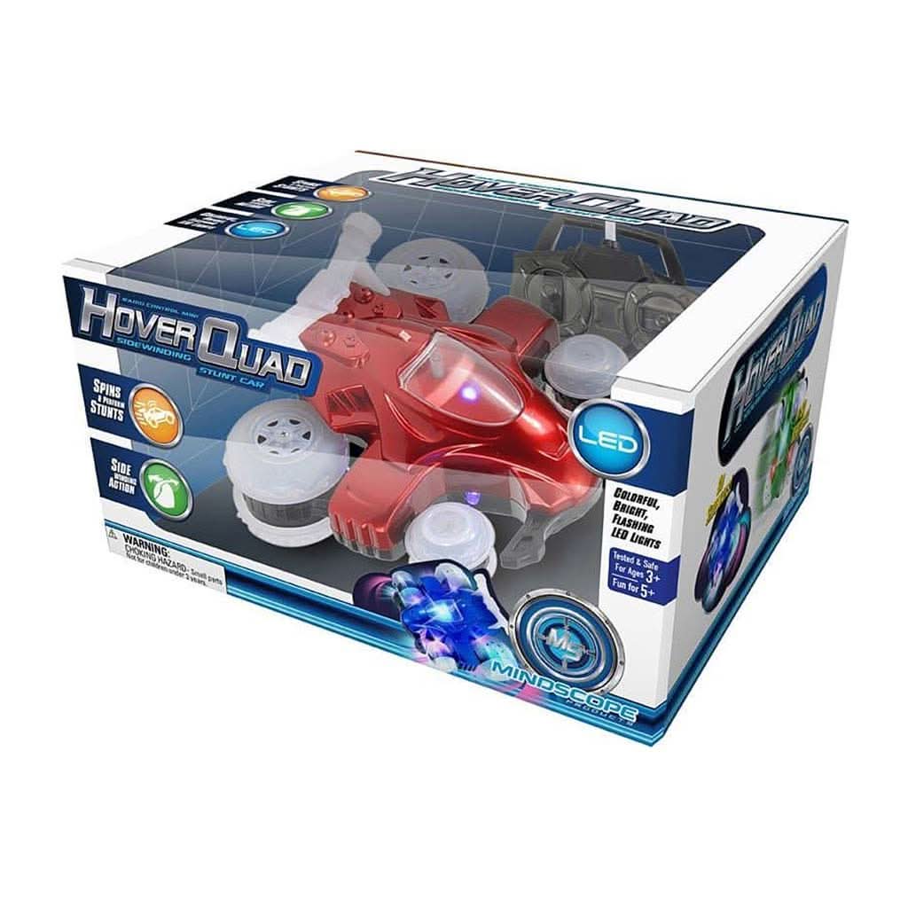 The MINDSCOPE HoverQuad Orange spins, does wheelies, and stands up! Side-to-side wheels and 6 flashing lights energize this tough, remote-controlled stunt vehicle. Requires 8 AA batteries.