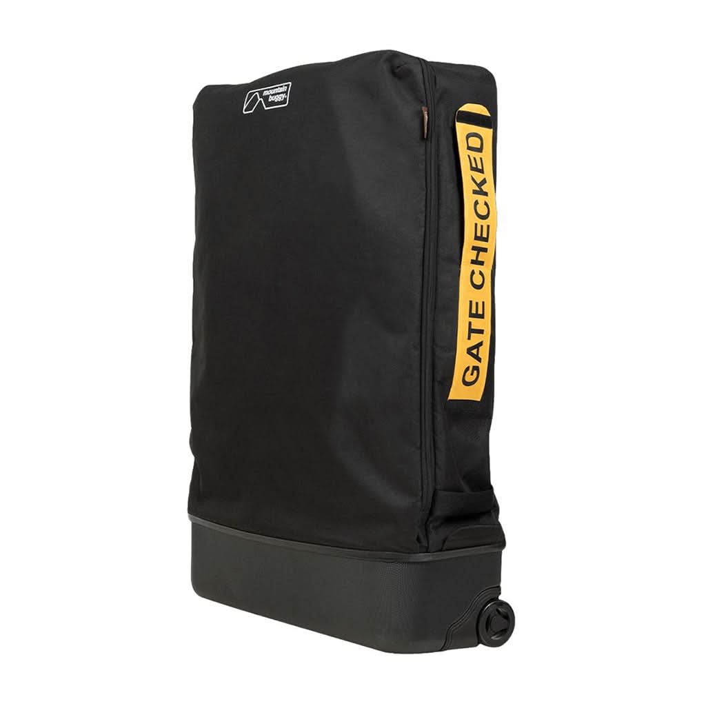 The travel bag features durable 900D fabrics, a freestanding structure, and a sleek black design that blends style with function. The handle grip and side handles allow for easy lifting and rolling through terminals. It folds ultra-compact for storage and is compatible with all 2015+ Mountain Buggy strollers, including duet™, nano duo™, swift™, urban jungle™, and more, as well as various other buggy brands.