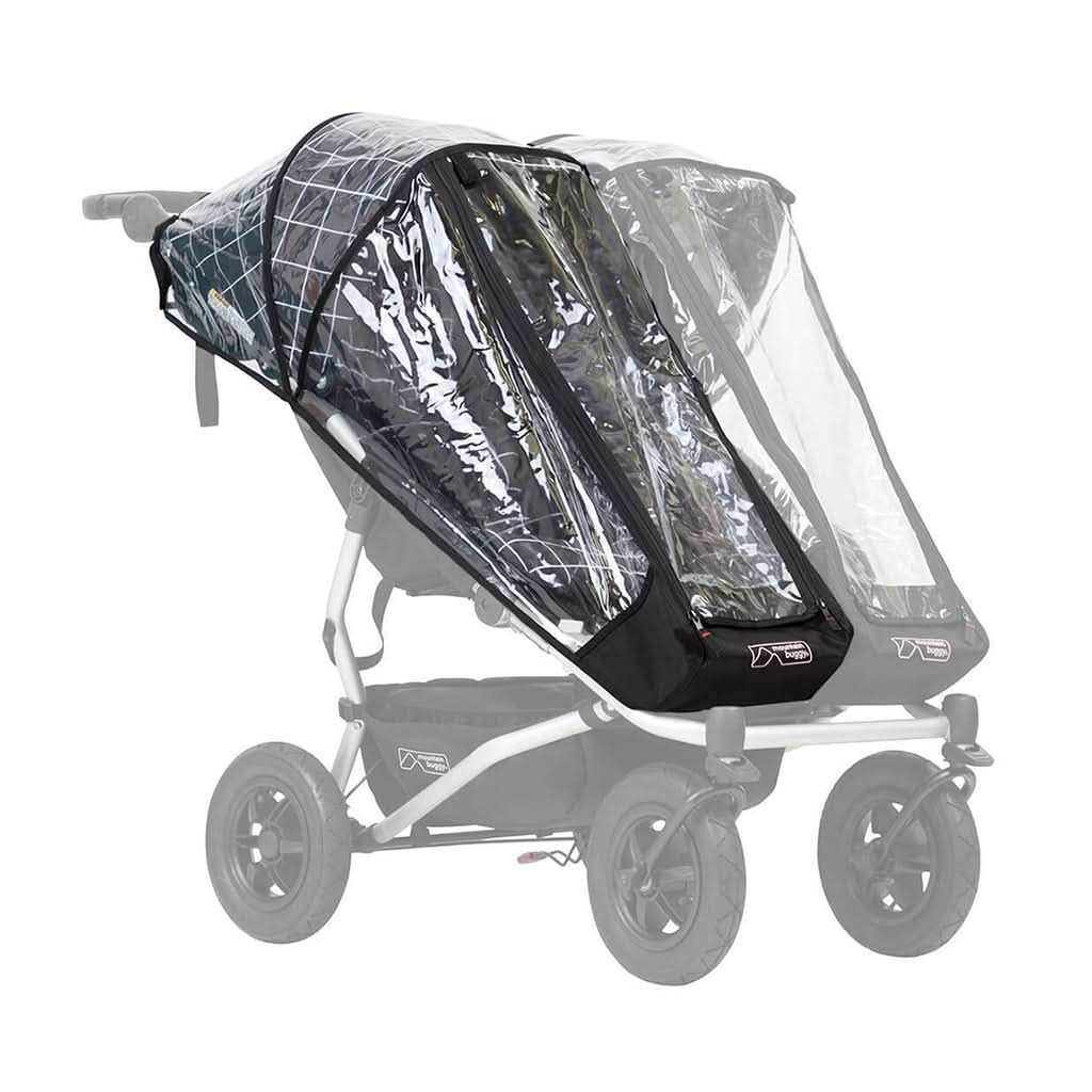 The Mountain Buggy V3 Duet Single Storm Cover is designed in a transparent finish with black trim and is custom-fitted for the duet™ buggy.