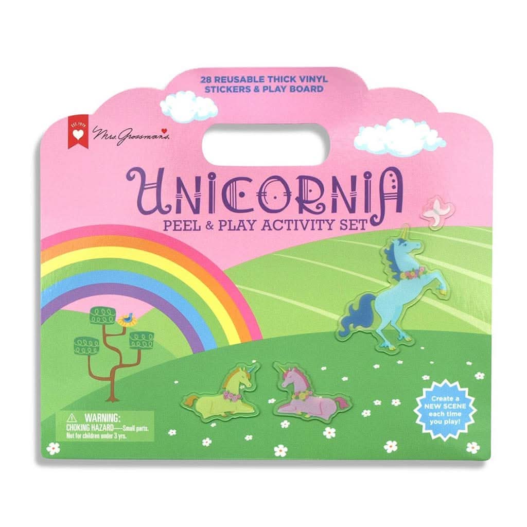 Mrs. Grossmans UNICORNIA Peel & Play activity set with 28 thick, reusable stickers featuring unicorns in pastel hues, sweet bunnies, birds, butterflies, and more! Contains hours of fun and imaginative play. The activity set folds out into a reusable play board with a match & learn interior storage area. Easy to carry and peel, learn and play! Great for travel!
