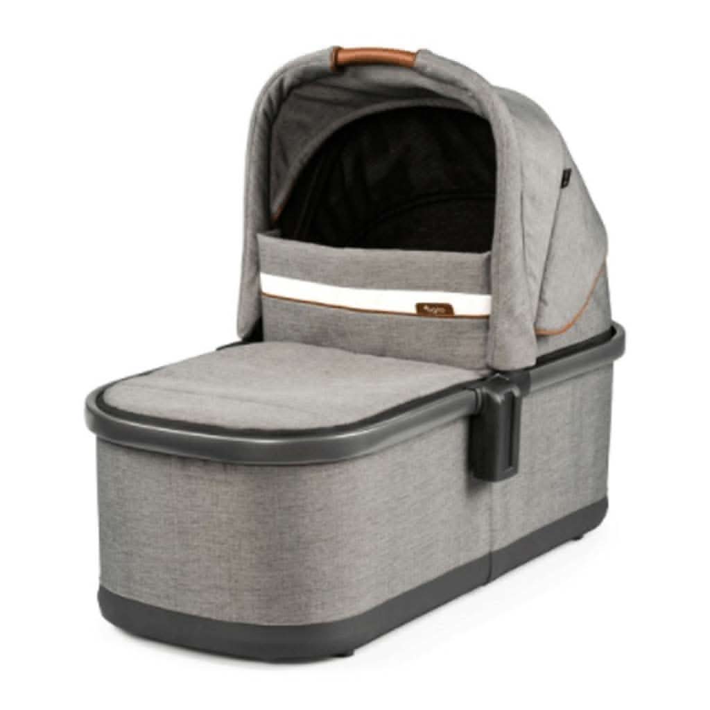 This innovative bassinet can fold for carrying and storing. It includes an externally adjustable headrest and a hood with mesh insert that provides air circulation. It also has a removable mattress and is approved for overnight sleeping.