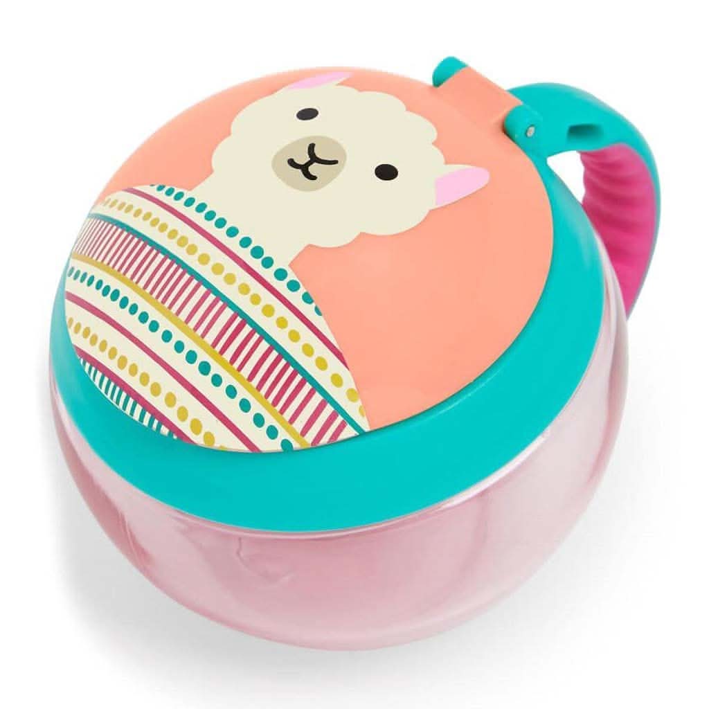 Skip Hop Zoo Snack Cup, Llama encourages independent snacking without the mess. The easy-grip handle is sized just right for little hands, and the snap-top lid ensures food stays fresh. The flexible inside opening keeps snacks from spilling out - even if it's tipped over. With two lids there's less mess and mom's bag stays crumb-free.