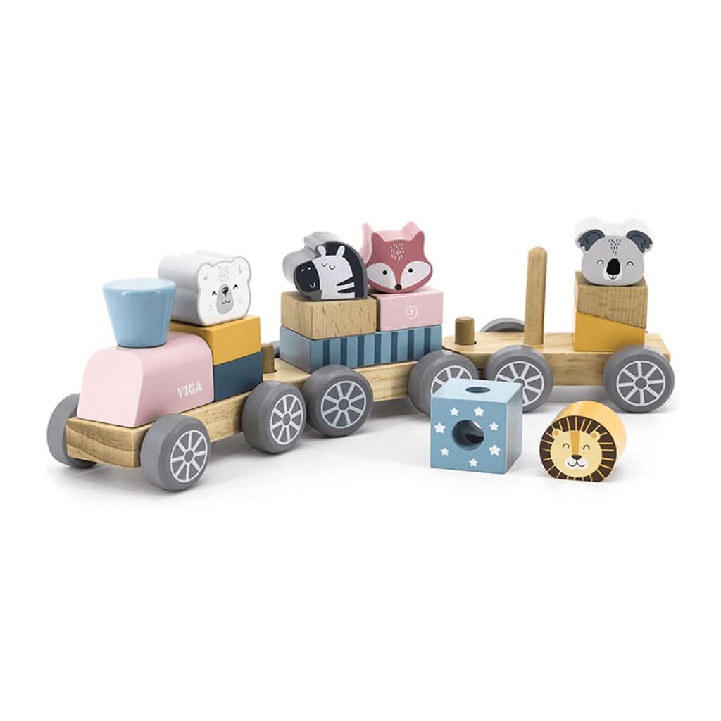 The Stacking Train from The Original Toy Company features 18 charming wooden pieces for children ages 18 months and older. The cargo of colorful blocks and easy-to-clasp animals can be loaded in the cars for a ride.