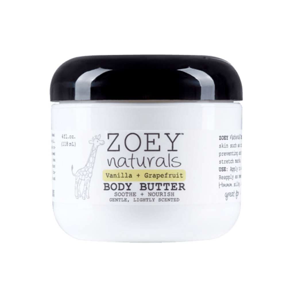 Zoey Naturals entire line of family products are free of harsh chemicals and gentle on the environment. Zoey Naturals Body Butter 4 oz. Vanilla Grapefruit is great for dry, irritated skin such as cradle cap and also assists in preventing and minimizing the appearance of stretch marks.